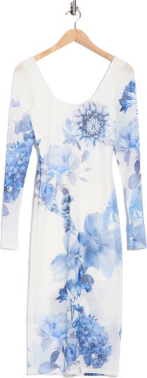 Delicate stretch mesh blooms with floral buds, sculpting a graceful midi dress. Finished with a flattering scoop neckline and elegant three-quarter sleeves.
