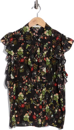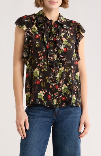 Pure silk shapes a floaty, lightweight blouse romanced with ruffled trim, a cute bow and an enchanting floral print.