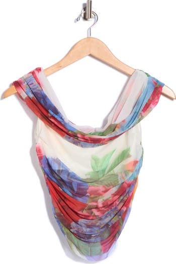 Painterly blooms cover this day-to-night top fashioned with an off-the-shoulder neckline and abbreviated sleeves.