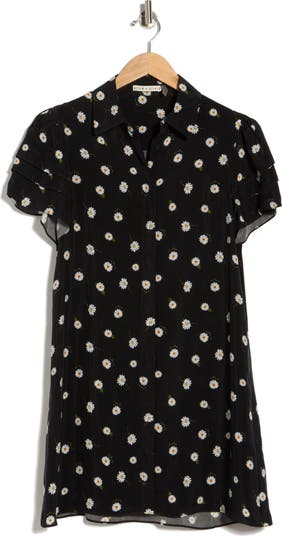 A cheerful daisy print brightens this short‑sleeve shirt dress styled with a classic spread collar for a fresh, easygoing look.
