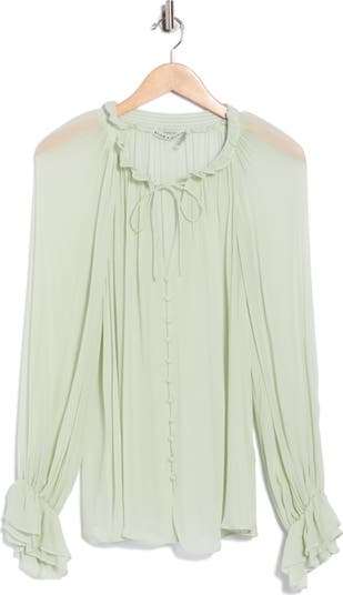 A semisheer woven top is instantly sweetened by a tied neckline and blousy sleeves with ruffled cuffs that make it a perfect choice for everyday outings.