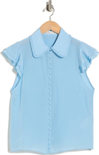 A ruffled collar and fluttery cap sleeves bring whimsical charm to this lightweight button-up top cut from luxuriously smooth silk.