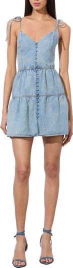 Light-wash denim adds a retro Americana vibe to this tiered, mini-length sundress fastened with dainty straps that easily adjust for a perfect fit.
