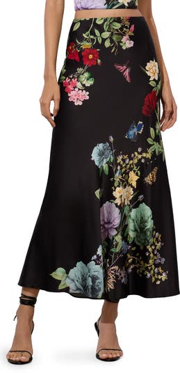A realistic print of birds and butterflies flying throughout vibrant blooms makes this bias-cut satin maxi skirt extra enchanting.