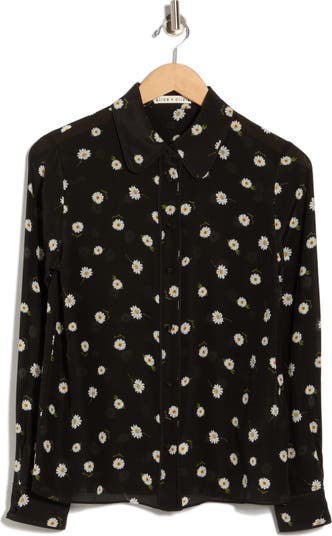 Scattered daisies adorn this smooth silk button-up shirt framed by a Peter Pan collar and solid piping for a polished touch.