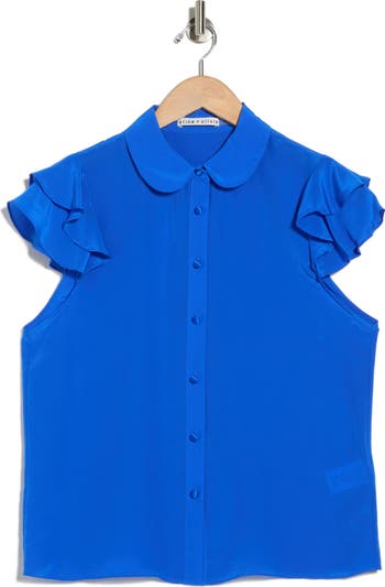 Brighten your day with this luxuriously soft silk-blend top framed by a rounded collar and ruffled cap sleeves for sweet style.