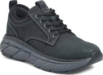 - Leather upper/textile lining/rubber sole