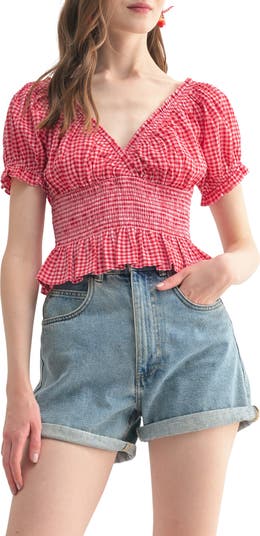 Be picnic-ready in a puff-sleeve top covered in cheery checks and shaped with sweet smocking.