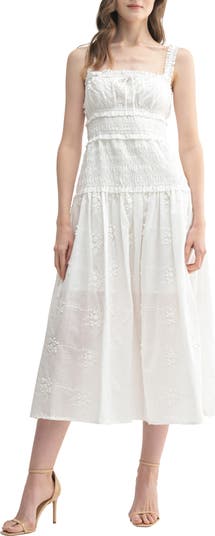 Add enchantment to your white dress options in a winsome all-cotton choice textured in tonal blooms and cut to a beloved midi length.
