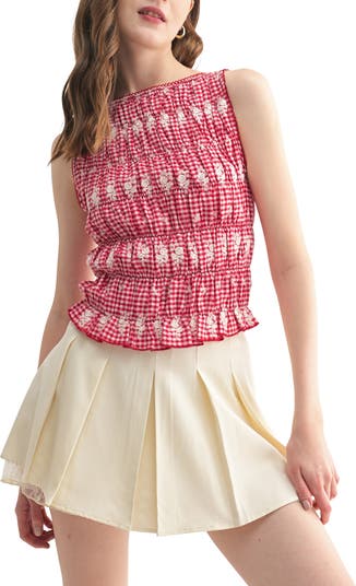Allover shirring shapes a charming gingham-checked top that adds to the sweetness with embroidered posies and dainty scalloped trim.