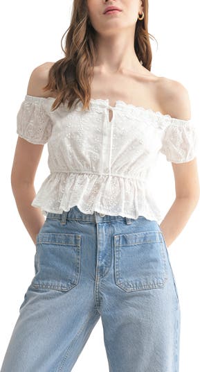Lacy embroidery and airy eyelets sweeten this shoulder-baring top cut from breezy cotton and finished with a fluttering frilled peplum.