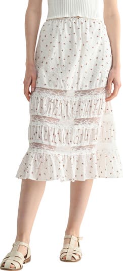 Lilts of lace and tiny blooms sweeten a cotton skirt cut to a beloved midi length.