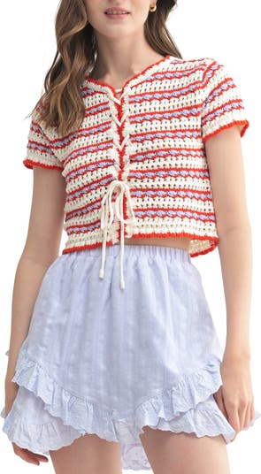 Airy, open stitches lighten up the look and feel of this boxy striped cardigan that finishes with a lace-up closure to give it a bit of a homemade vibe.