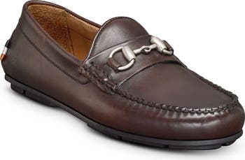 Brushed metal hardware and a moc toe distinguish a sleek leather driving loafer grounded by a cushioned footbed with open-cell foam supporting the arch.