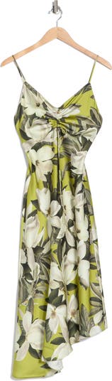 A bold floral print brings resort-ready charm to this smooth sateen slipdress framed by dainty straps, ruching front ties and a chic asymmetric hem.