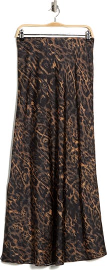 From day to night, this bias-cut maxi skirt cut from leopard-patterned satin fabric brings a fiercely wild flair to any look.