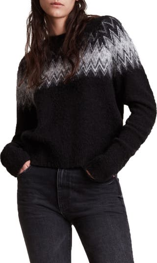 Diamond-shaped geometric patterning challenges the classic Fair Isle look in this updated crewneck sweater made from a fuzzy blend of wool and alpaca.