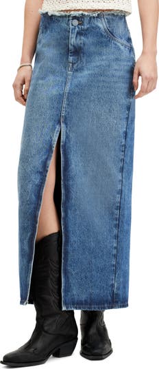 Artful fraying at the waist adds to the lived-in appeal of this casual-staple maxi skirt made from nonstretch denim.