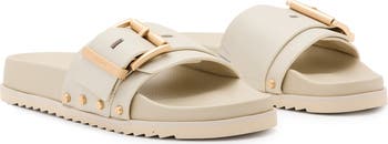 Polished studs and buckle hardware bring a bit of moto edge to this updated slide sandal.