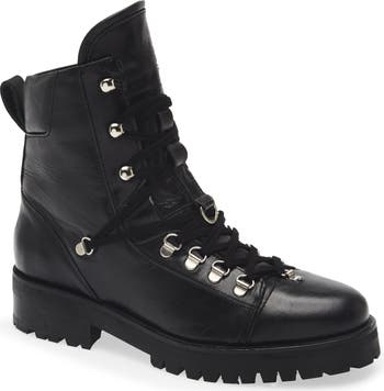 Gleaming eyelets detail the vamp of a utilitarian hiker boot set on a heavily lugged rubber sole for excellent traction wherever you go.