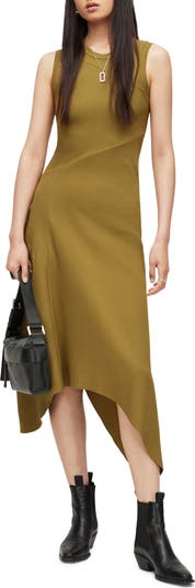 Soft ribbing gives shapely texture to this sleeveless crewneck maxi finished with a drapey asymmetrical hemline.
