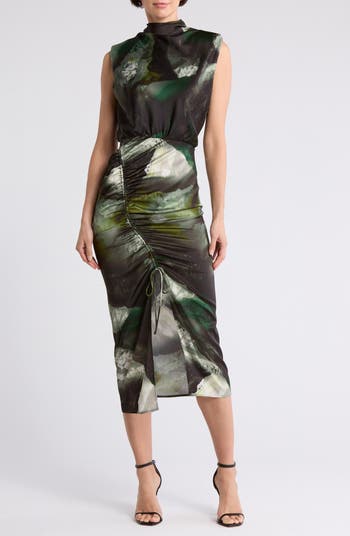 A moody, ethereal pattern defines this mock-neck dress shaped with gentle ruching throughout the midi-length skirt.