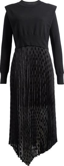 Tonal dots dapple a pleated slipdress that's right for wintry festivities thanks to the matched merino wool sweater you can add when you're on the way and subtract when you arrive.