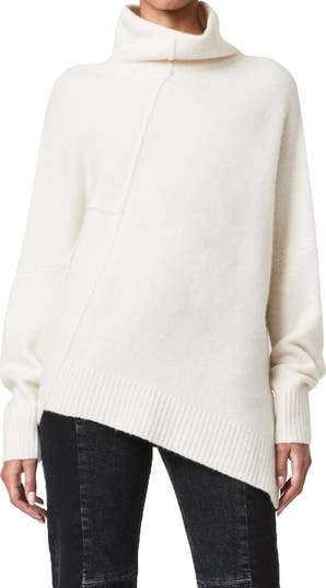With a razor-sharp asymmetrical hem, striking seaming detail down the front and a cool roll neck, this cozy wool-blend sweater adds modern edge to your look.