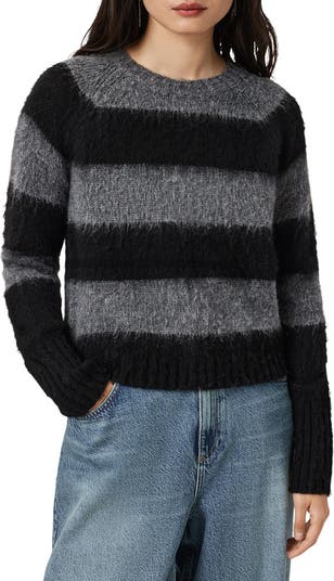 Patterned in bold stripes, this sweater knit from a cozy wool-enriched blend sports an indulgently fuzzy feel and a fit that slouches like an old favorite.