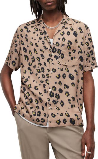 Leopard spots pounce with personality all over this drapey short-sleeve sport shirt finished with a chest patch pocket.