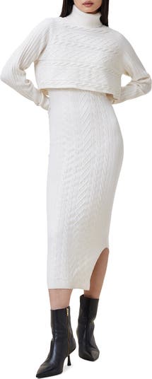 A fold-over turtleneck kicks off the look of this cable-stitch alpaca-kissed sweater-and-dress duo that's an elegant way to get cozy for the season.