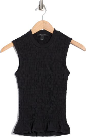 Allover shirring creates the sleek, structured fit of this sleeveless top that gives way to a flouncy peplum for a flirty finish.