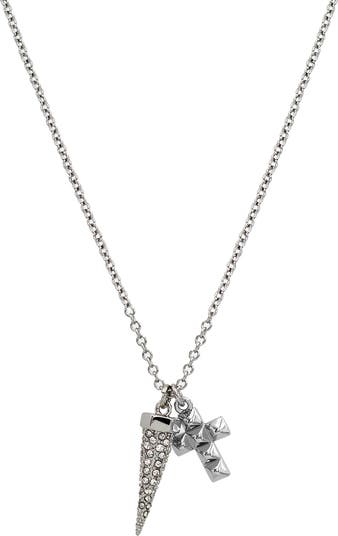 Channel fierce energy in this gleaming necklace featuring a pyramid-studded cross charm and crystal pavé bullet pendant.