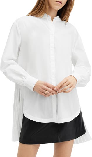 Make a modern style statement in this oversized button-front shirt shaped from smooth satin.