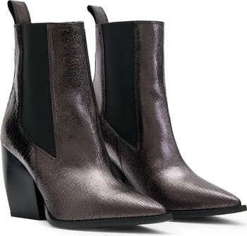 Lavish crinkled leather adds textural intrigue to a pointy-toe Chelsea boot lifted by a block heel.