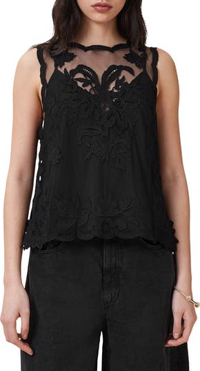 Flowery stitching romances this sheer scallop-trimmed top made with a slinky cami lining.