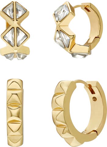 Mix up your look with this set of glossy huggie-hoop earrings that catch the light with a geometric texture and sparkly crystals.