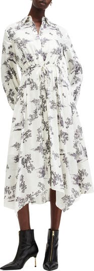 Gorgeous linen-and-silk fabric covered in dreamy blooms is shaped into this billowy long-sleeve shirtdress finished with a fluttery handkerchief hem.
