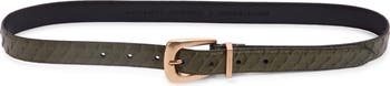A classic buckle secures this snake-embossed leather belt that'll serve as a statement staple for your wardrobe.