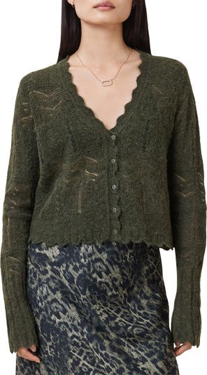 Scalloped edges add a fanciful twist to this lightweight open-stitched sweather knit from a supersoft wool-rich blend.