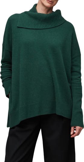 An asymmetric, split turtleneck adds to the cozy goodness of this slouchy sweater knit from a toasty blend of wool-kissed cashmere yarns.