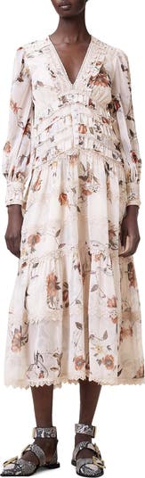 Mixed-lace trims and tiered ruffles create an enchanting duo of textures on a long-sleeve midi dress that's chic and romantic in its moody floral print.