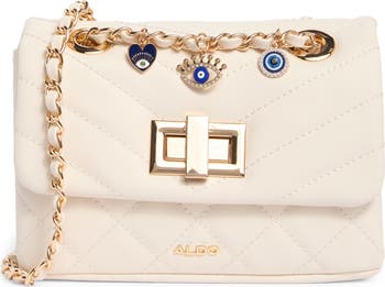 A gleaming strap and evil-eye charms bring chic boho vibes to this quilted crossbody bag featuring a secure foldover flap and dual interior compartments.
