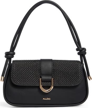 Gleaming hardware frames this minimalist shoulder bag fashioned with a knotted strap and fold-over flap closure.
