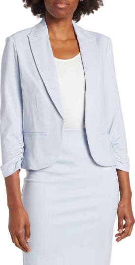 Scrunched 3/4 sleeves fit this casual blazer-style jacket with allover mini stripes.
