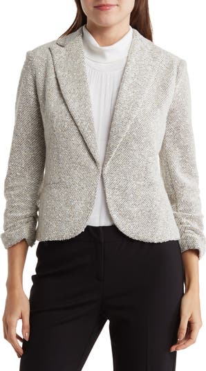 Bouclé tweed and scrunched three-quarter sleeves upgrade this staple blazer with a more casual, easy-to-style look.