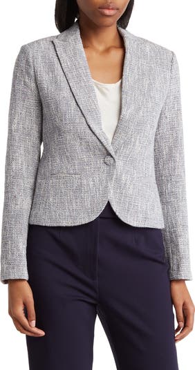 A single button front blazer features peaked lapels and a light tweed colorway for classic style.