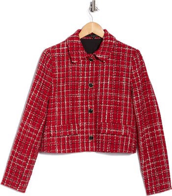Top your look with the posh attitude that comes with this cropped tweed blazer done in a bold hue that always commands attention.