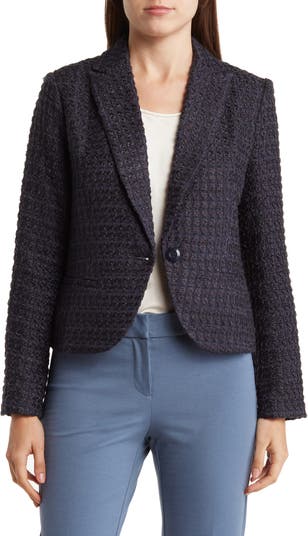Elevate your wardrobe with a cropped blazer contructed from a textured bouclé knit with a one-button closure and peaked lapels.