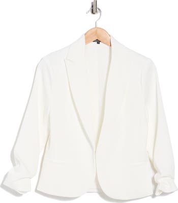 Exude polished style with this solid jacquard blazer framed by peaked lapels and ruched three-quarter sleeves.
